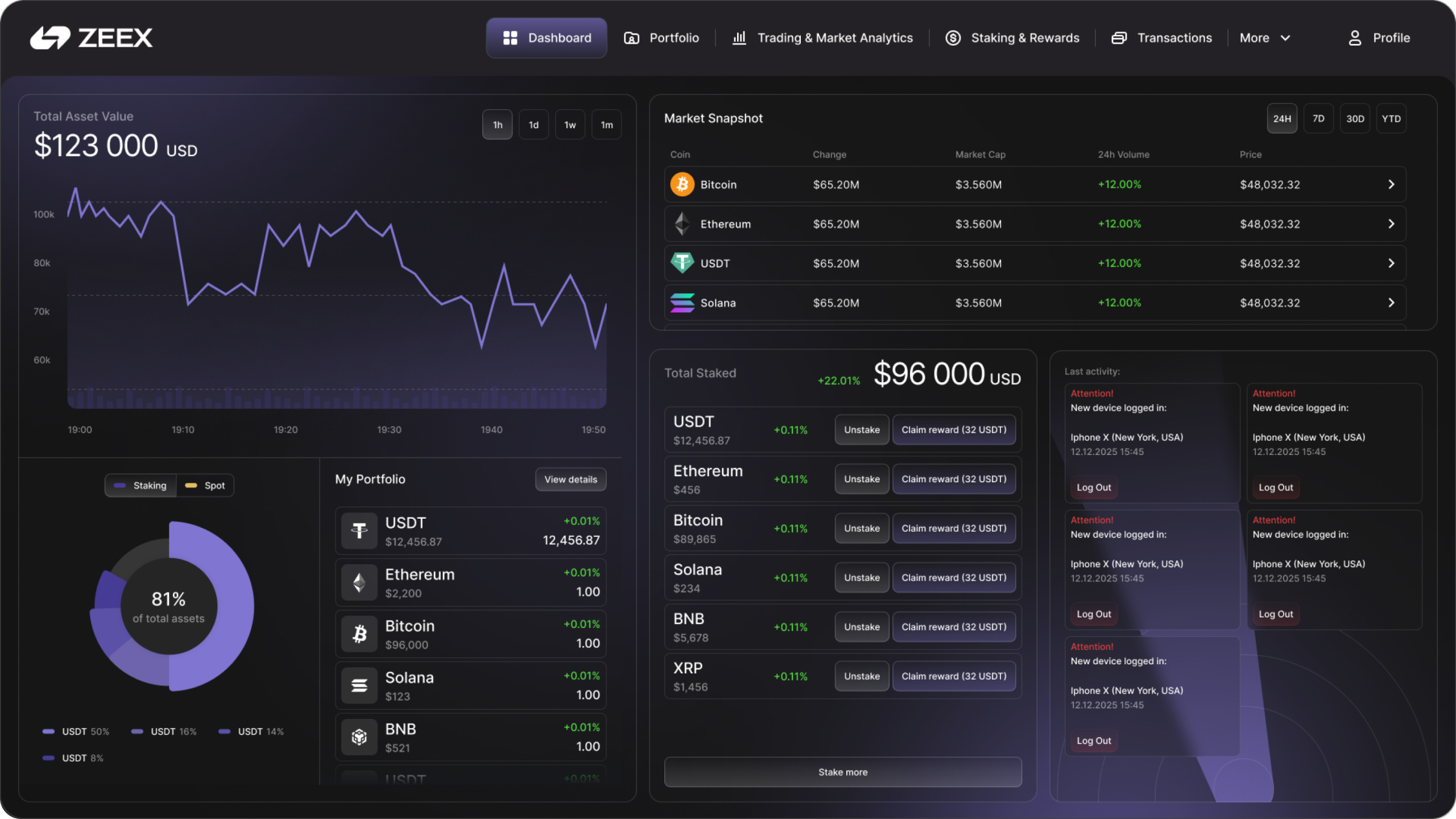 We analyzed how users monitor portfolios and make staking decisions, focusing on clarity, trust, and speed. Insights shaped the structure of charts, asset lists, and status messaging to reduce cognitive load in data-dense screens.
